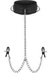 Imagine the seductive combination of collar and clamp, pleasure and pressure. Master Series has your fix with Submission Collar and Clamp Union. This two in one set is made with submission in mind. The quality collar is made more comfortable with the addition of a neoprene inner lining, and secures by means of a double Velcro binding. The collar has two extra D rings, if you want to add weights, rope, or any other accessory you can imagine. This duo features a 14 inch chain that splits in two at 8 inches, attaching to the collar at a front D ring. Each chain ends at an adjustable alligator style nipple clamp, easily made tighter with thumb screws. Each clamp has a vinyl tip for added comfort and better grip. Adorn the neck of your naughty one with this striking collar, as the chain dangles seductively against their chest.Measurements: