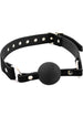 Leather, adjustable buckle strap with a red or black rubber ball gag.