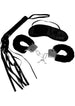 1 pair black furry metal nickel free handcuffs. 1 black satin blindfold. 1 16 inch (40 cm) black whip.